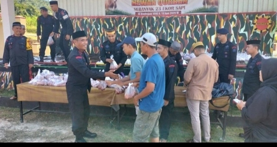 Kolaka Utara – Jajaran Batalyon C Pelopor Brimob Polda Sulawesi Tenggara (Sultra) yang bermarkas di Desa Totallang, Kecamatan Lasusua, Kabupaten Kolaka Utara, merayakan Idul Adha 1446 H dengan menyembelih sebanyak 19 ekor sapi kurban yang berasal dari sisipan gaji setiap anggota Brimob perbulannya, Hewan kurban ini kemudian dibagikan kepada warga kurang mampu di sejumlah desa dari dua kecamatan, yakni Lasusua dan Lambai.