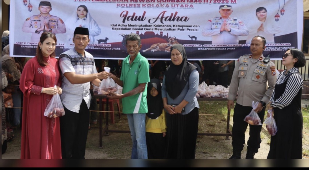 Usai pelaksanaan Sholat Idul Adha, kegiatan dilanjutkan dengan penyembelihan 14 ekor sapi qurban. Sebanyak 12 ekor dipotong di Polres Kolaka Utara, sementara masing-masing 1 ekor disembelih di Polsek Tolala dan Polsek Lasusua. Daging qurban dibagikan melalui 400 lembar kupon kepada masyarakat sekitar dan juga kepada personil Polres sebagai bentuk kepedulian sosial dan implementasi nilai-nilai Idul Adha.