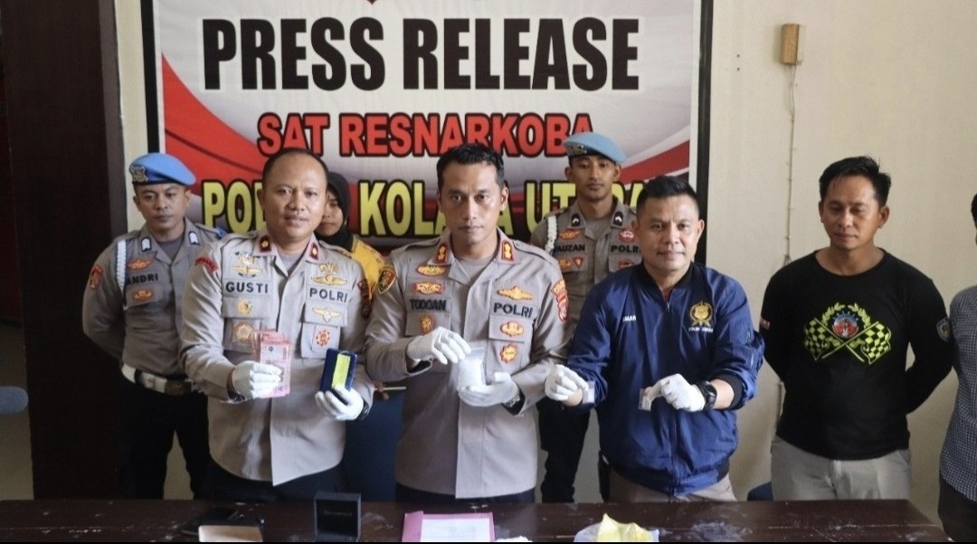 Saat dilakukan rilis Narkoba Jenis Sabu, di kantor Polres Kolaka Utara,  Kapolres Kolut AKBP Ritman Todoan Agung Gulton didampingi Wakapolres Kompol Gusti bersama Kasat Narkoba Iptu Batmar Ricki, dan KBO Narkoba Ipda Muliadi kala, dan berjejer barang bukti diatas meja.